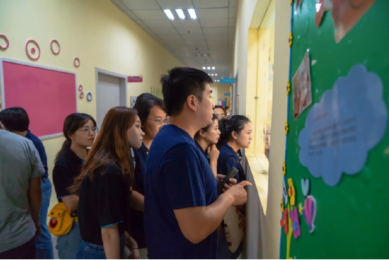 志愿者們首先參觀了孩子們的學校,葛老師向志愿者們介紹說,孩子們入校時會根據綜合能力分級,進行不同程度的課程安排。有鍛煉個人獨立學習能力的個人工作系統教程,有鍛煉孩子手部精細化操作的精細教程,還有通過游戲方式了解社會、人際溝通交往的游戲社交教程等。整體課程分為階梯性安排,隨著學習能力的不斷完善和提升,孩子們有機會成功晉級至幼小銜接班,可以踏入社會與普通孩子們一起正常上課。孩子們的康復離不開家長的陪護,因此學校除了有針對孩子的評估教學,還有為家長而專門準備的理論和操作培訓班,讓家長們可以更細致、更專業地陪伴孩子一起康復。