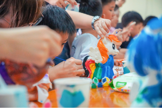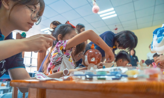 隨后,志愿者們與幼小銜接班的孩子們進行了涂鴉互動小游戲,志愿者們與孩子們一起結對,運用顏料在儲蓄罐上增添屬于自己的色彩,描繪著孩子們眼中斑斕的世界。孩子們對于色彩都表現出了極大的樂趣,有照著圖示一步步描繪的,有天馬行空隨意搭配的,也有跳脫畫筆,用手掌創意畫畫的……伴隨著孩子們清脆的笑聲,一個個別致的儲蓄罐慢慢成型,我們在他們的眼眸中看到了他們的世界,也感受著整個夜空被他們的雙手點亮,如星空般璀璨,如銀河般浩瀚。在歡聲笑語中,此次志愿者活動取得了圓滿的成功。