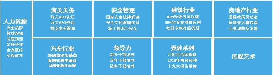 ??? 中智大學(xué)發(fā)揮資源優(yōu)勢(shì)與多年的行業(yè)經(jīng)驗(yàn),在黨建、領(lǐng)導(dǎo)力、人力資源、海關(guān)關(guān)務(wù)、安全管理、傳媒藝術(shù)、建筑行業(yè)、房地產(chǎn)行業(yè)、汽車行業(yè)等領(lǐng)域開發(fā)出了系列爆款產(chǎn)品,打造全場(chǎng)景覆蓋,混合型學(xué)習(xí)和管理,行業(yè)級(jí)培訓(xùn)解決方案。