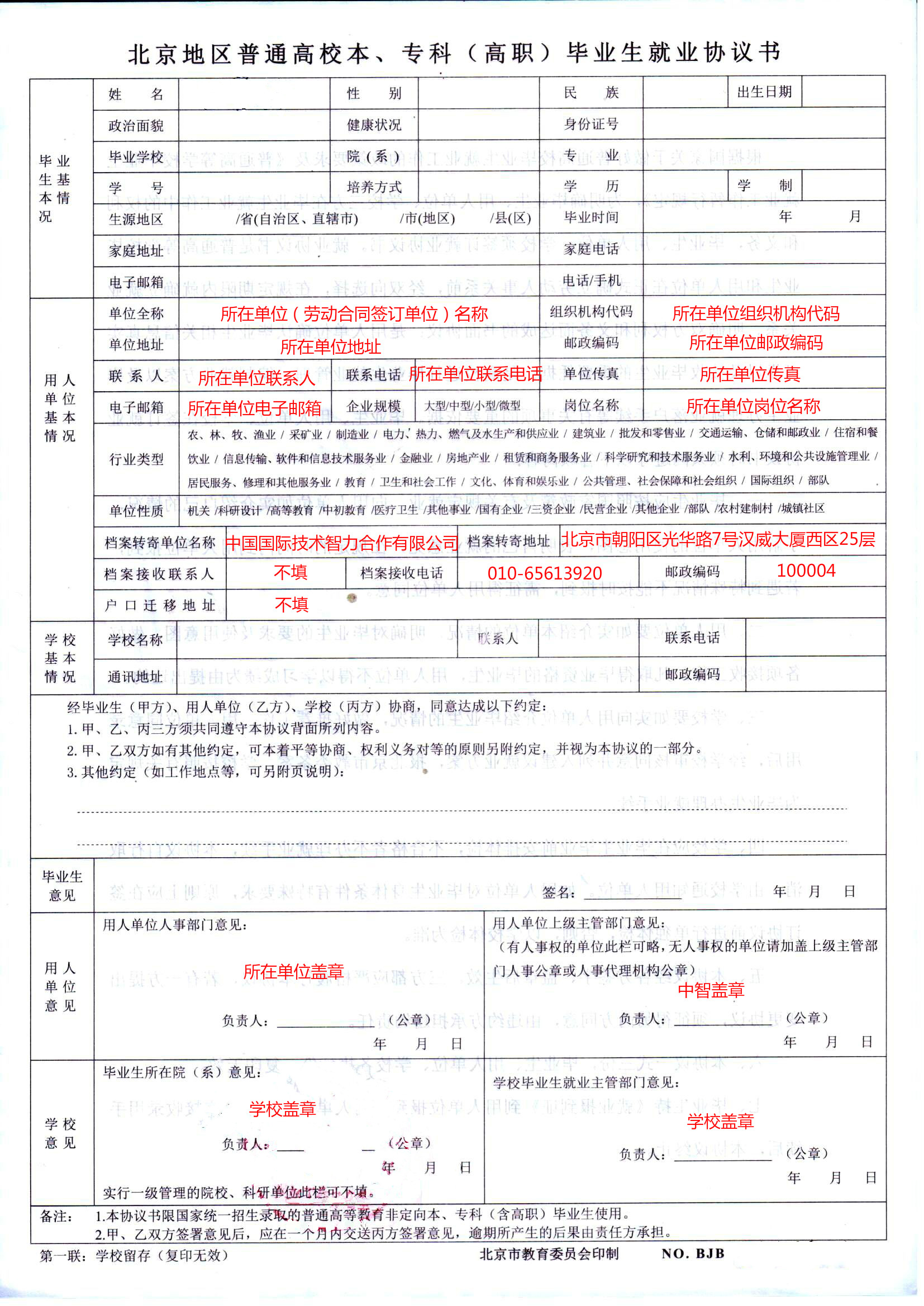 3、三方《就業協議書》(有關內容填寫格式如下注意事項,本人簽字,公司蓋章)