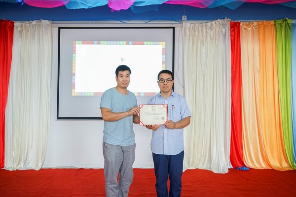 康復中心的孩子們為了回饋愛心人士們的關心和幫助還特意舉行了文藝匯演。 “小星星”們努力的展示著自己學習的成果,爸爸媽媽們也一個個獻出了精彩的表演贏得陣陣掌聲。在文藝匯演的舞臺上,浙江中智工會蘆平主席代表浙江中智“稚橙風”捐獻4萬元慈善資金,黨總支馮利國副書記接受康乃馨康復中心給予的慈善捐獻證書。