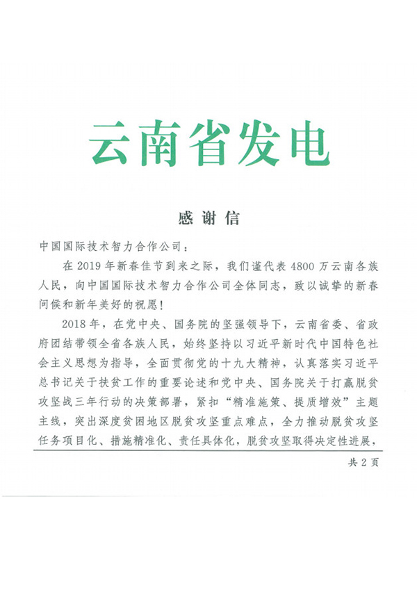 2019年春節(jié)前夕,中共云南省委、云南省人民政府向中智公司等單位發(fā)出感謝信,感謝中智公司等相關(guān)單位對云南脫貧攻堅的支持。希望中智公司進一步加大對云南的定點幫扶,為云南脫貧攻堅決戰(zhàn)2019年、決勝2020年做出更大貢獻。