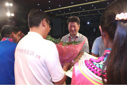 7月25日,愛飛翔開班儀式上,來自大姚的羅云老師代表鄉(xiāng)村教師發(fā)言,并向愛飛翔全國發(fā)起人崔永元、華東師大黨委書記童世駿贈送了自己親筆寫的書法作品,以表達對此次培訓(xùn)的期待。隨后,大姚老師穿著彝族衣服走上舞臺,極具彝族風(fēng)情的歌舞表演贏得滿堂喝彩。中智上海經(jīng)濟技術(shù)合作公司黨委副書記、工會主席郭平出席活動并發(fā)言,郭書記對鄉(xiāng)村教師們的到來表達了熱烈的歡迎,并從企業(yè)社會責(zé)任的角度講述中智長期來一直堅持和踐行的公益信念。