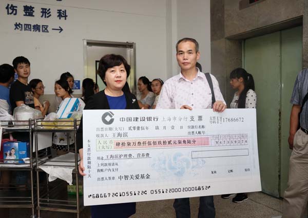2015年9月1日,瑞金醫(yī)院灼傷科病房外,一張47萬元的支票由中智集團(tuán)副總經(jīng)理王慧遞交給了火海英雄、“中智好雇員”王海濱的父親,這其中包含著無數(shù)的牽掛和關(guān)愛,“我們是代表所有募捐者來傳達(dá)我們的關(guān)心,希望海濱能盡早康復(fù),也希望你們能保重身體?!?/p>
